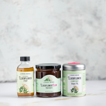 Bundle includes: Elderflower Comfort Tea, Elderflower Plum Preserves, and 4 oz California Elderflower Syrup.