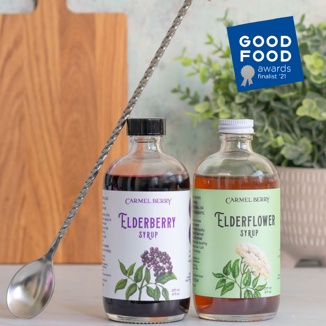 Bundle includes: 8 oz California Elderflower Syrup, 8 oz Fresh Pressed Elderberry Syrup, Stainless steel long handled bar spoon.